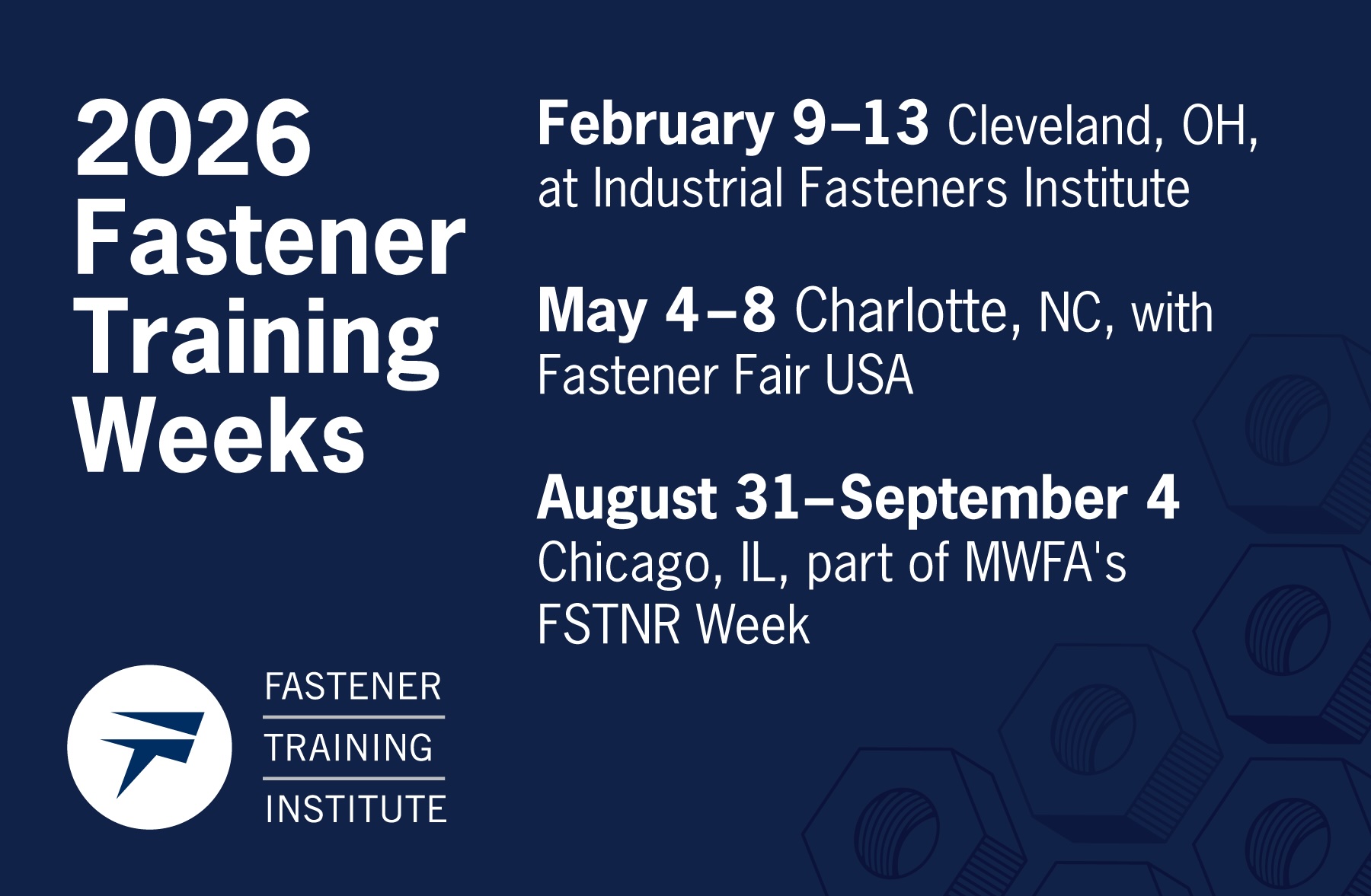 The first training week is February 9-13 in Cleveland, Ohio at the Industrial Fasteners Institute. The next is May 4-8 in Charlotte, North Carolina, in conjunction with Fastener Fair USA. The final week-long training for 2026 is August 31-September 4 in Chicago, Illinois, part of Mid-West Fastener Association’s FSTNR Week.